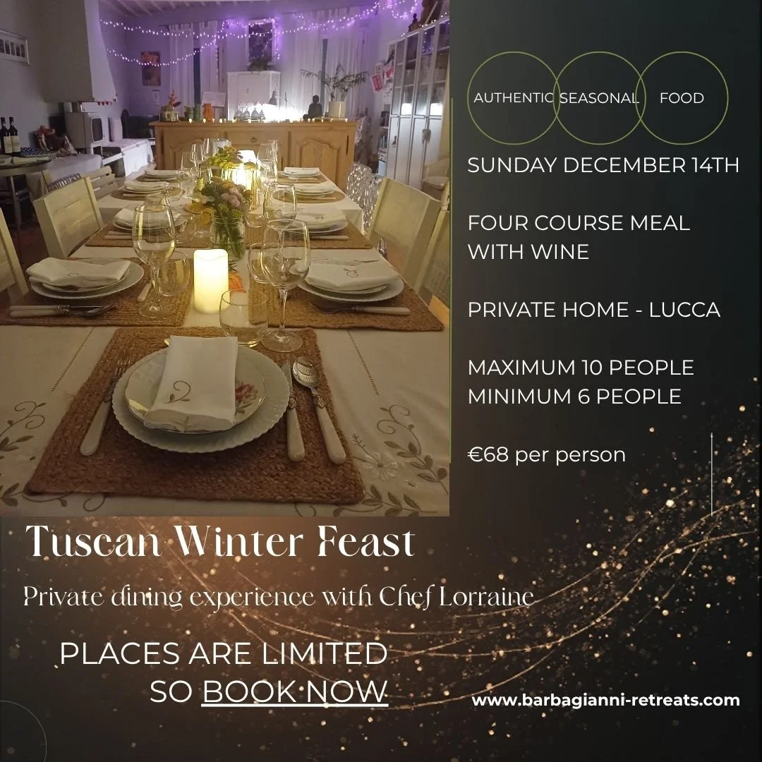 Savour the winter season with an intimate dining experience in a private home, where Chef Lorraine presents a four-course menu inspired by the rich flavours of Winter in Tuscany. Each dish showcases the best of the season’s harvest, perfectly paired with a curated wine tasting to complete the journey.